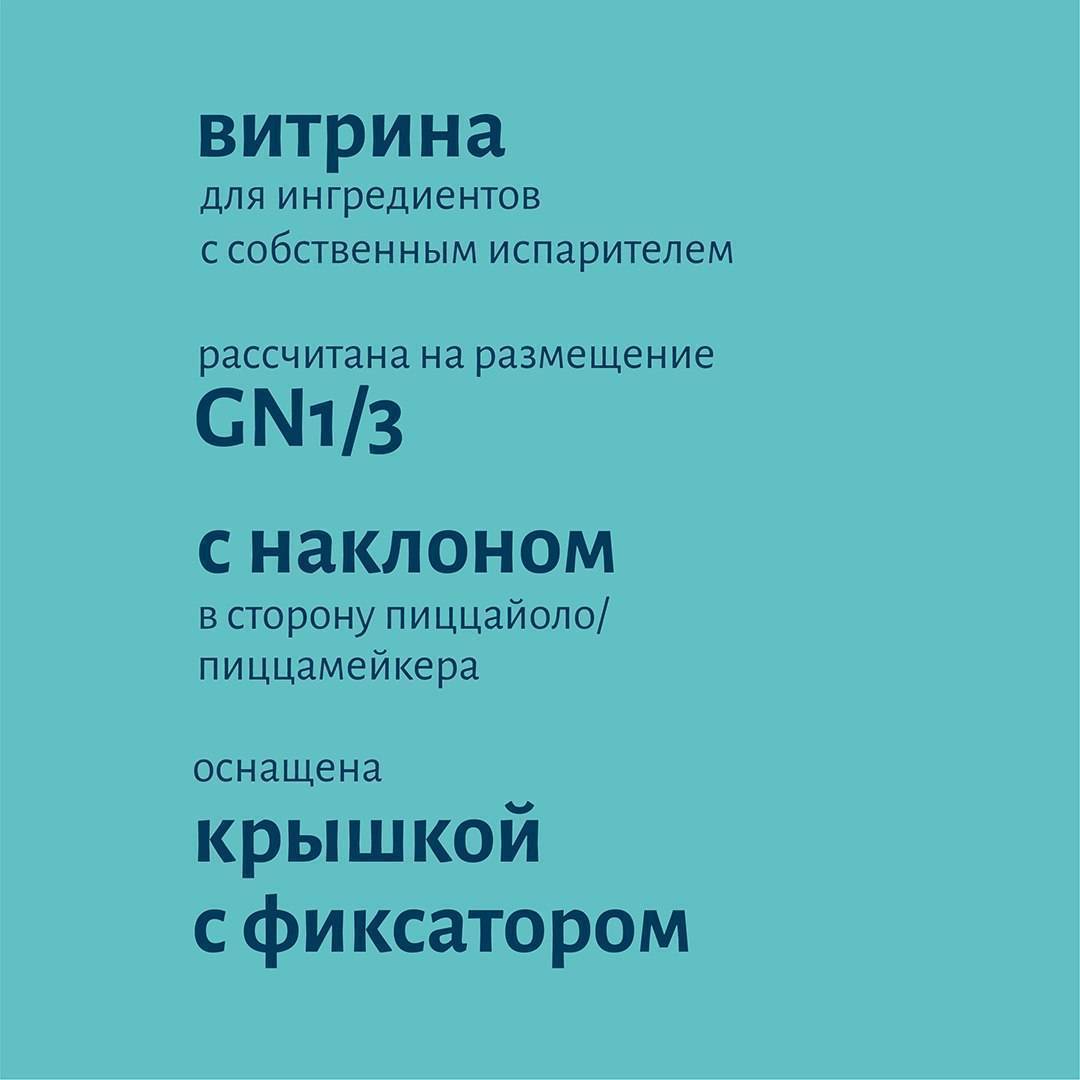 Модель даёт возможность размещать продукты в гастроёмкостях GN 1/3 при глубине стола 800 мм. Рабочая область на столешнице остаётся свободной, обеспечивая удобство приготовления пицц разного формата и использования различного инвентаря, в том числе ящиков для теста и листов 400х600 мм.