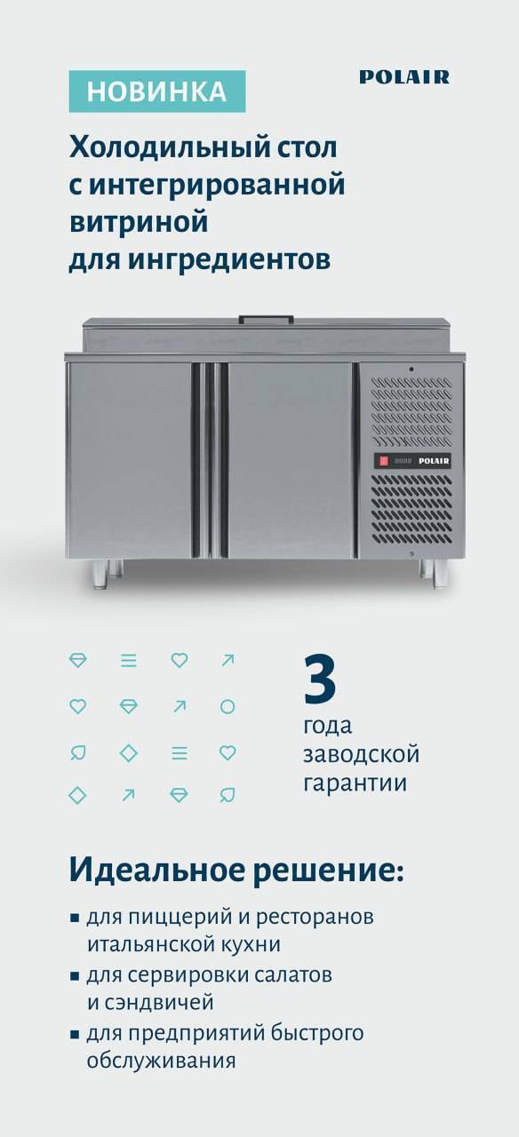 На прошедшей выставке индустрии гостеприимства компания Polair показала холодильный стол TM2ENvt-G со встроенной витриной для ингредиентов.