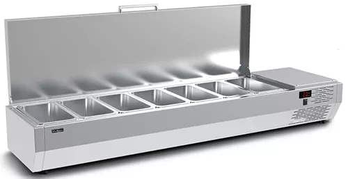 Витрина VT3-G (1/4) с откидной крышкой из нержавеющей стали рассчитана на гастроемкости GN 1/4 (7 шт.). При этом гастроемкости в комплект поставки не входят.