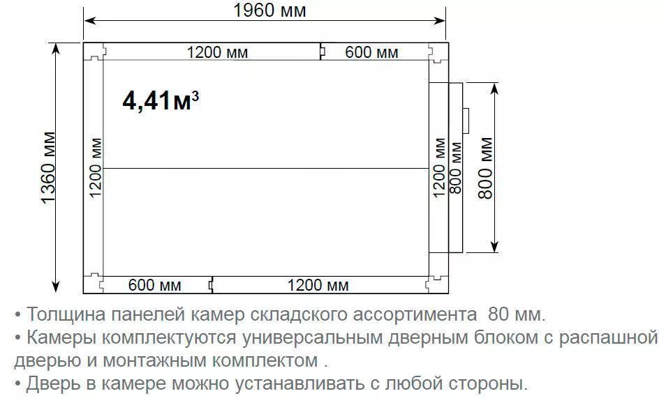 Относится к серии Standart, поскольку толщина панелей — 80 мм, что подходит для совместной эксплуатации со среднетемпературными агрегатами. Может эксплуатироваться при внешней температуре от -30 до +40°C. При размещении на улице рекомендуется установить навес.