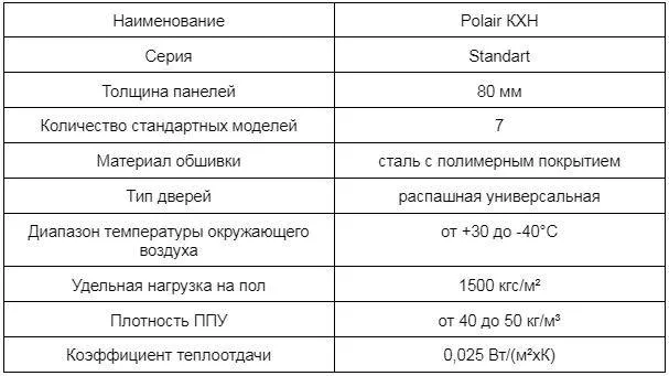 Холодильная камера Polair КХН — это сборно-разборная панельная конструкция с теплоизоляцией из пенополиуретана. Наличие удобных соединений «шип-паз» обеспечивает простоту сборки. Оборудование применяется для хранения продовольственных или непродовольственных товаров на складах торговых, производственных предприятий, а также на кухнях заведений общественного питания.