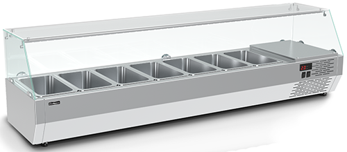 Витрина VT3v-G со стеклянным защитным колпаком рассчитана на гастроемкости GN 1/3 (7 шт.). При этом гастроемкости в комплект поставки не входят.<br />