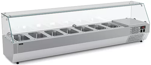 Витрина VT3v-G со стеклянным защитным колпаком рассчитана на гастроемкости GN 1/4 (7 шт.). При этом гастроемкости в комплект поставки не входят.