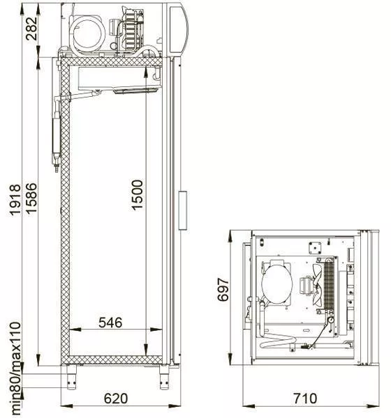 Размеры холодильника составляют 697×710×1960 мм, с верхним расположением агрегата для равномерного распределения холода в пределах температурного режима от +1°C до +10°C.