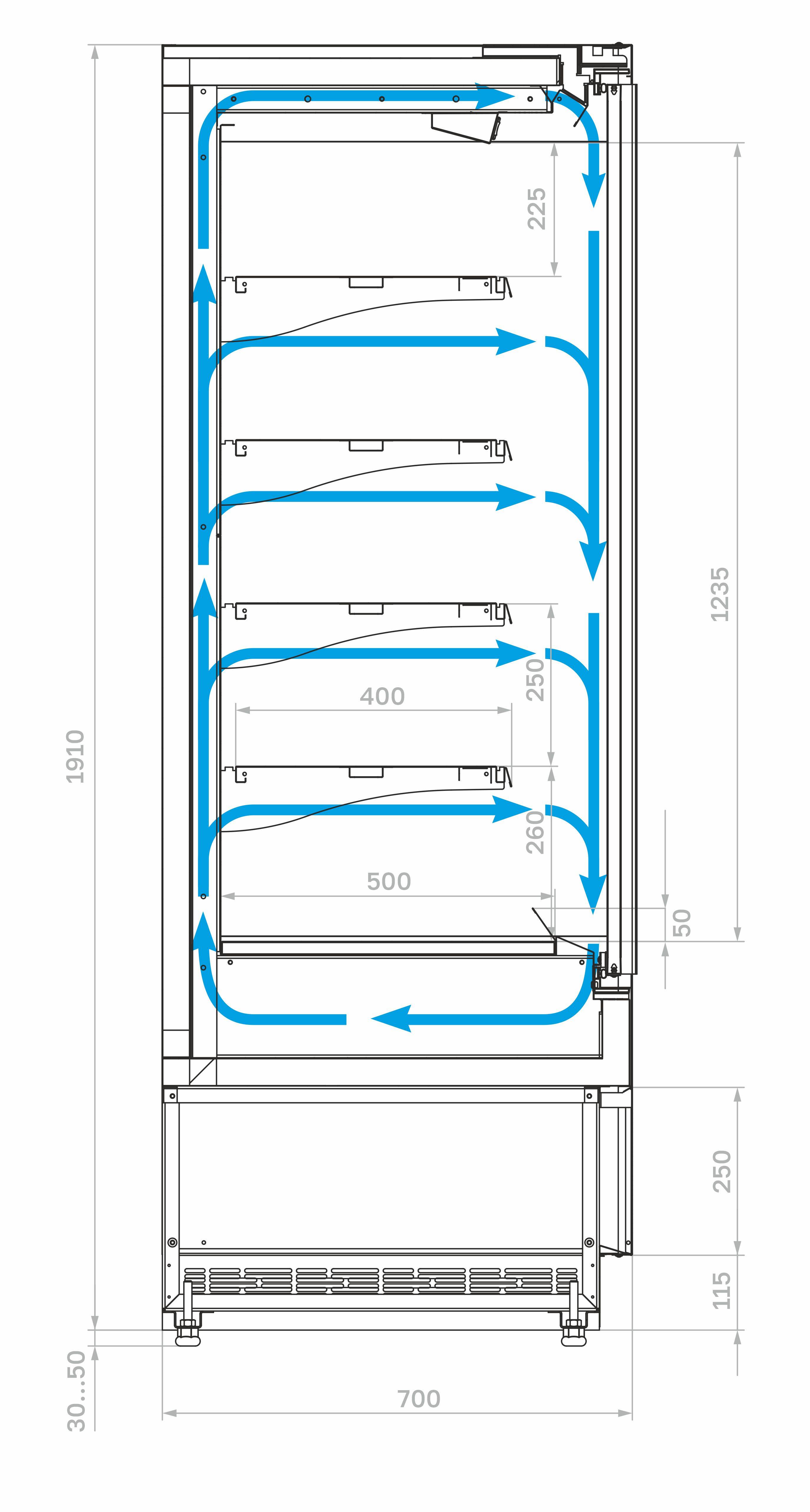 Витрина должна быть установлена не ближе 2 м от отопительных приборов. Запрещается эксплуатация витрины при попадании на нее прямых солнечных лучей, воздушных потоков от кондиционеров, вентиляторов и обогревателей.