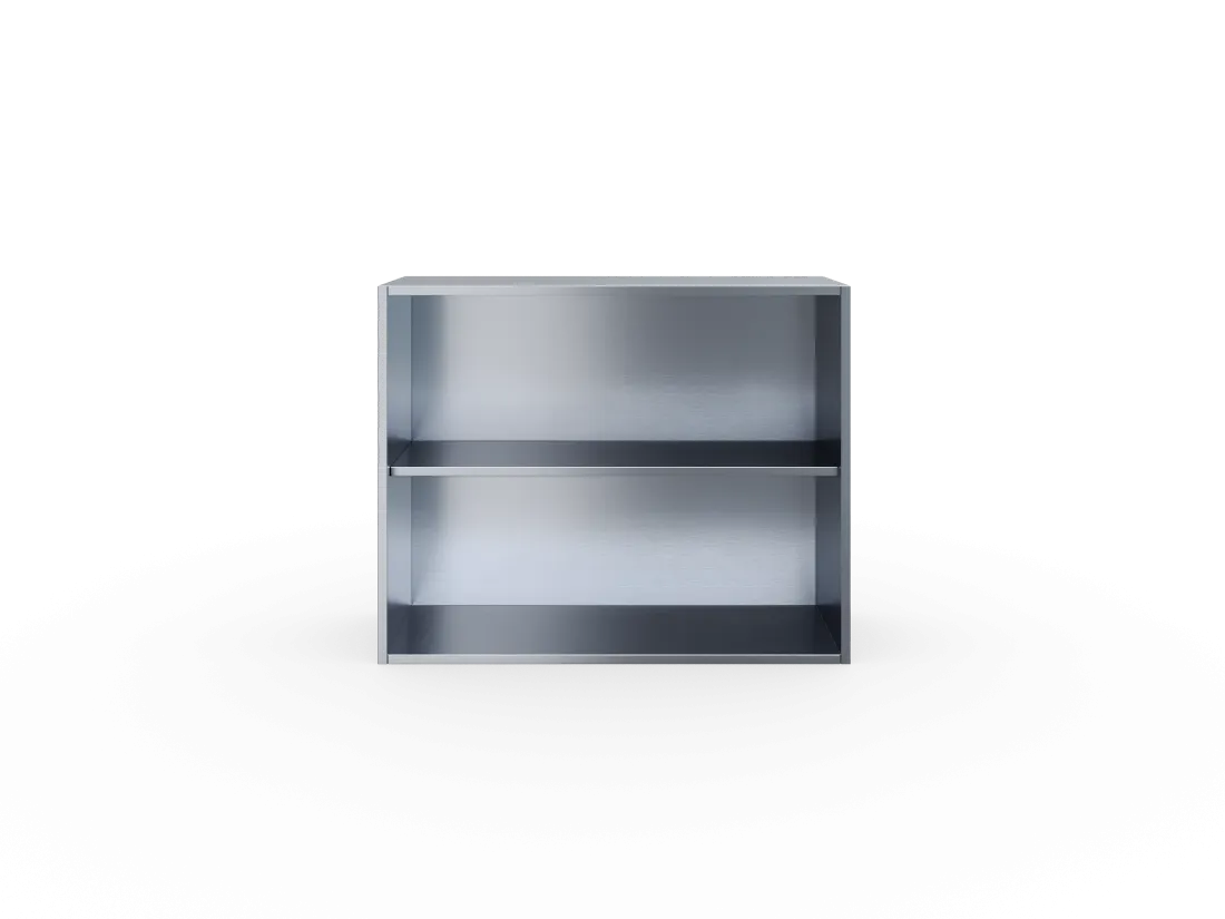 Полка настенная выполнена из из стали марки AISI 430 и толщиной 0,8 мм. Полка закрытая без дверей. В упакованном виде изделие имеет габариты 1000х300х600 мм.
