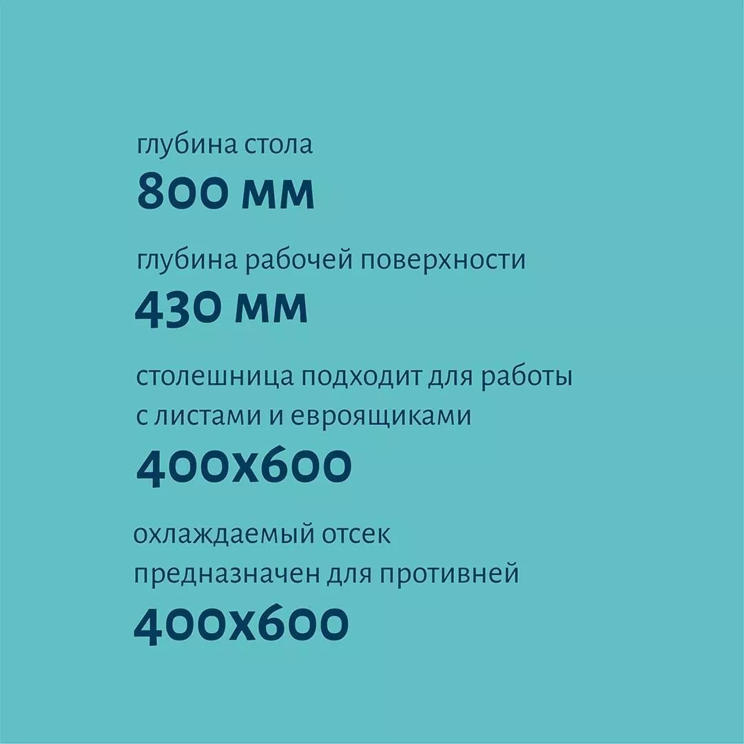 Модель даёт возможность размещать продукты в гастроёмкостях GN 1/3 при глубине стола 800 мм. Рабочая область на столешнице остаётся свободной, обеспечивая удобство приготовления пицц разного формата и использования различного инвентаря, в том числе ящиков для теста и листов 400х600 мм.